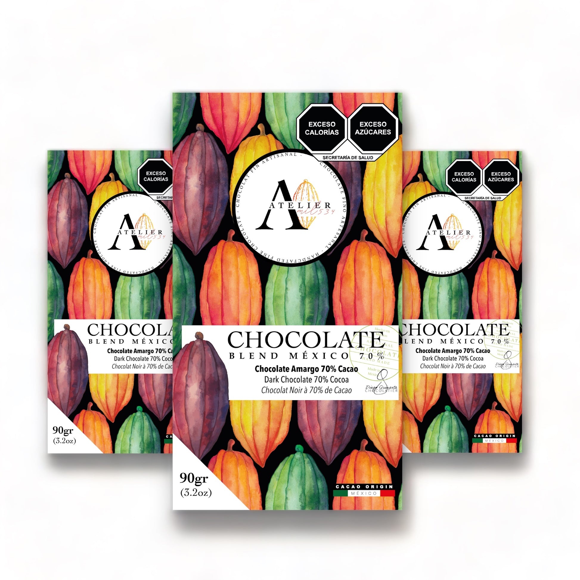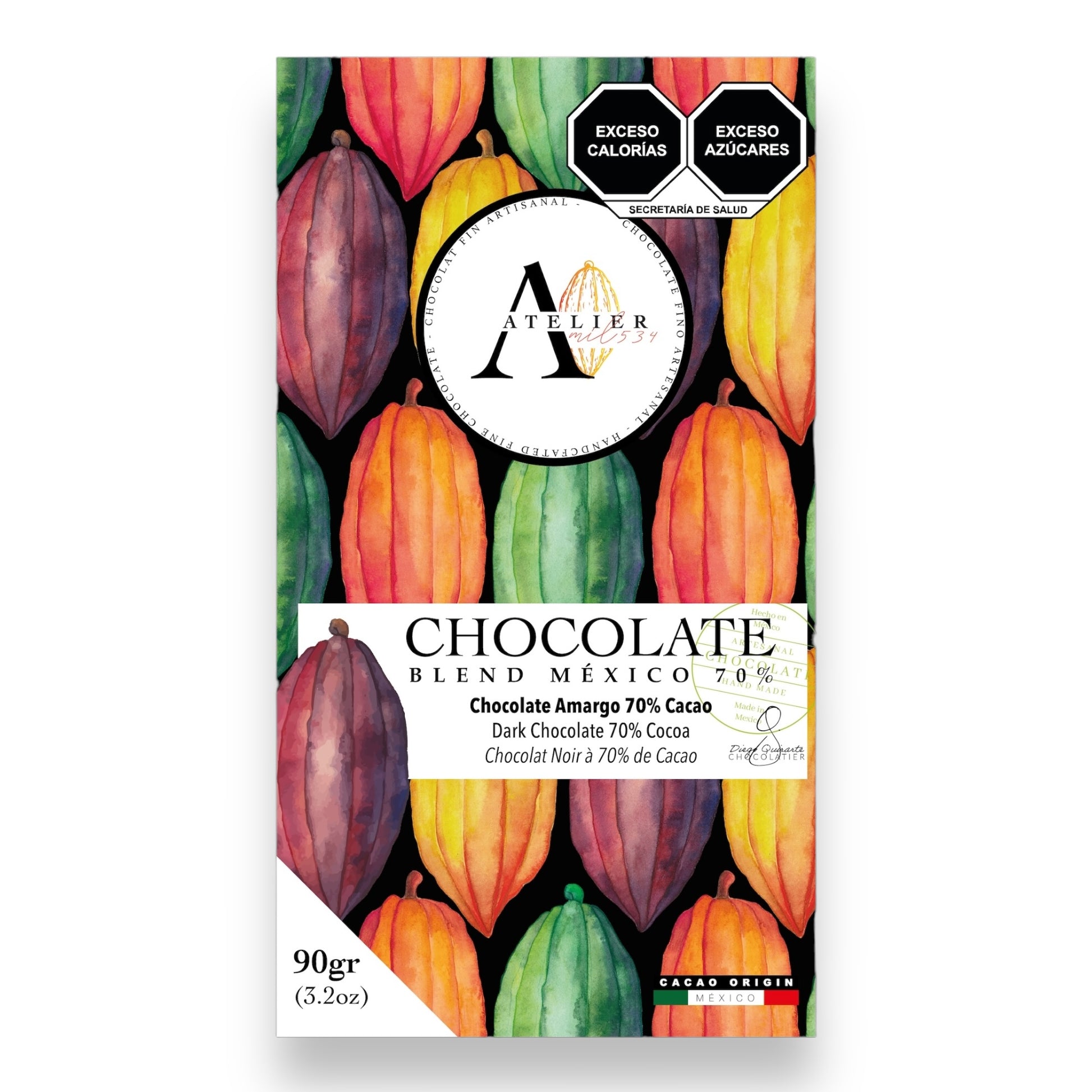 Disfruta de la BARRA 70% BLEND MX, 90g. Esta barra de chocolate contiene una mezcla de cacaos mexicanos y azúcar para un sabor autentico y elegante. El 70% de cacao ofrece un gusto intenso y equilibrado. Disfruta de un sabor único.